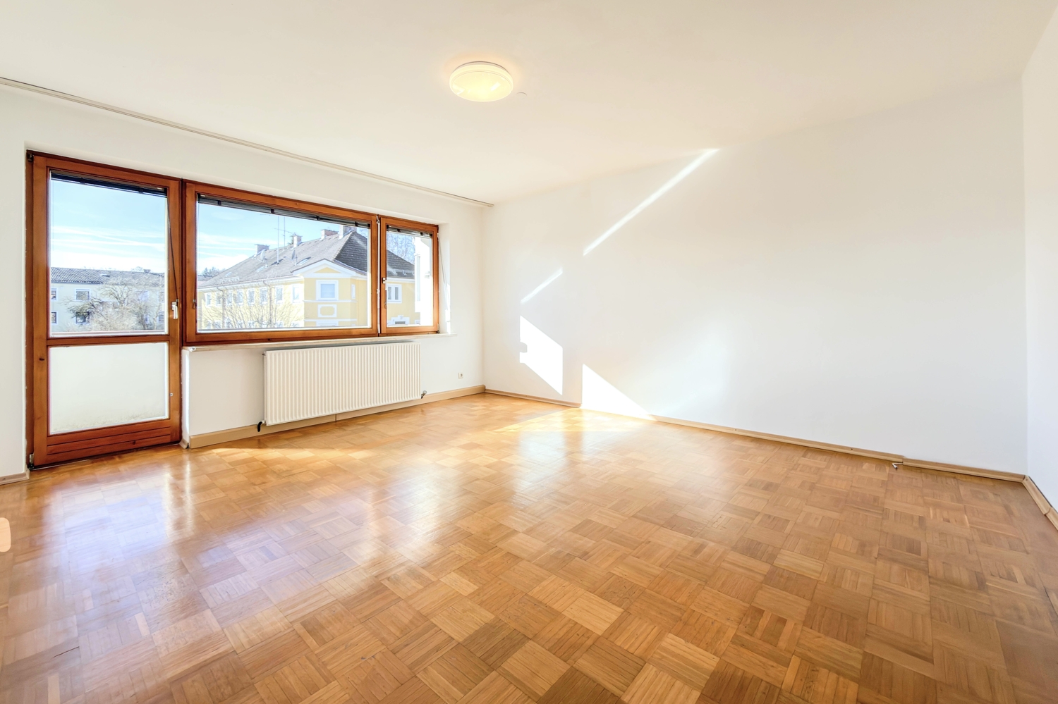Das Wohnzimmer der Wohnung verfügt über ein großes Südfenster und ist mit Parkettboden ausgestattet. Von hier aus gelangt man sowohl auf den überdachten Südbalkon als auch in ein uneinsehbares Schlaf- oder Arbeitszimmer. Durch die überdachte Bauweise und den zusätzlichen Windschutz bietet der Balkon auch an kühleren Tagen einen angenehm sonnigen Platz.