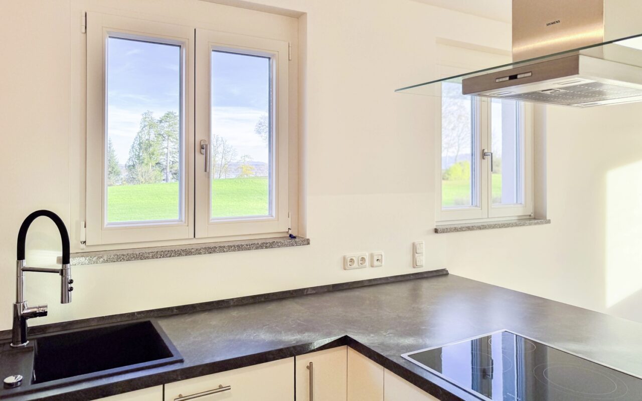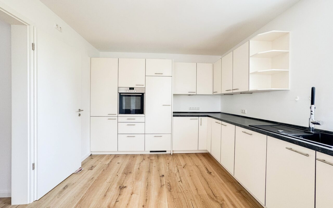 Der offen gestaltete Wohn- und Kochbereich schafft ein modernes und luftiges Raumgefühl. Die hochwertige Einbauküche fügt sich harmonisch in das Gesamtbild ein und bietet, auch dem ambitionierten Koch, Platz die Familie und Gäste zu verwöhnen. Vom angrenzenden Essbereich genießen Sie den Blick auf den See. Der Zugang zum Balkon erweitert den Wohnraum nach außen und lädt zum Verweilen ein.